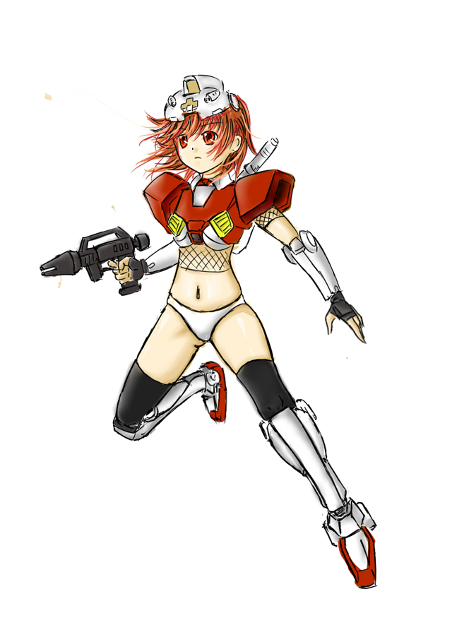 beam rifleenergy gunfingerless glovesfishnetsglovesgunhelmetmecha musumenavelpantiesred eyesred hairshort hairsolothighhighsunderwearweapon