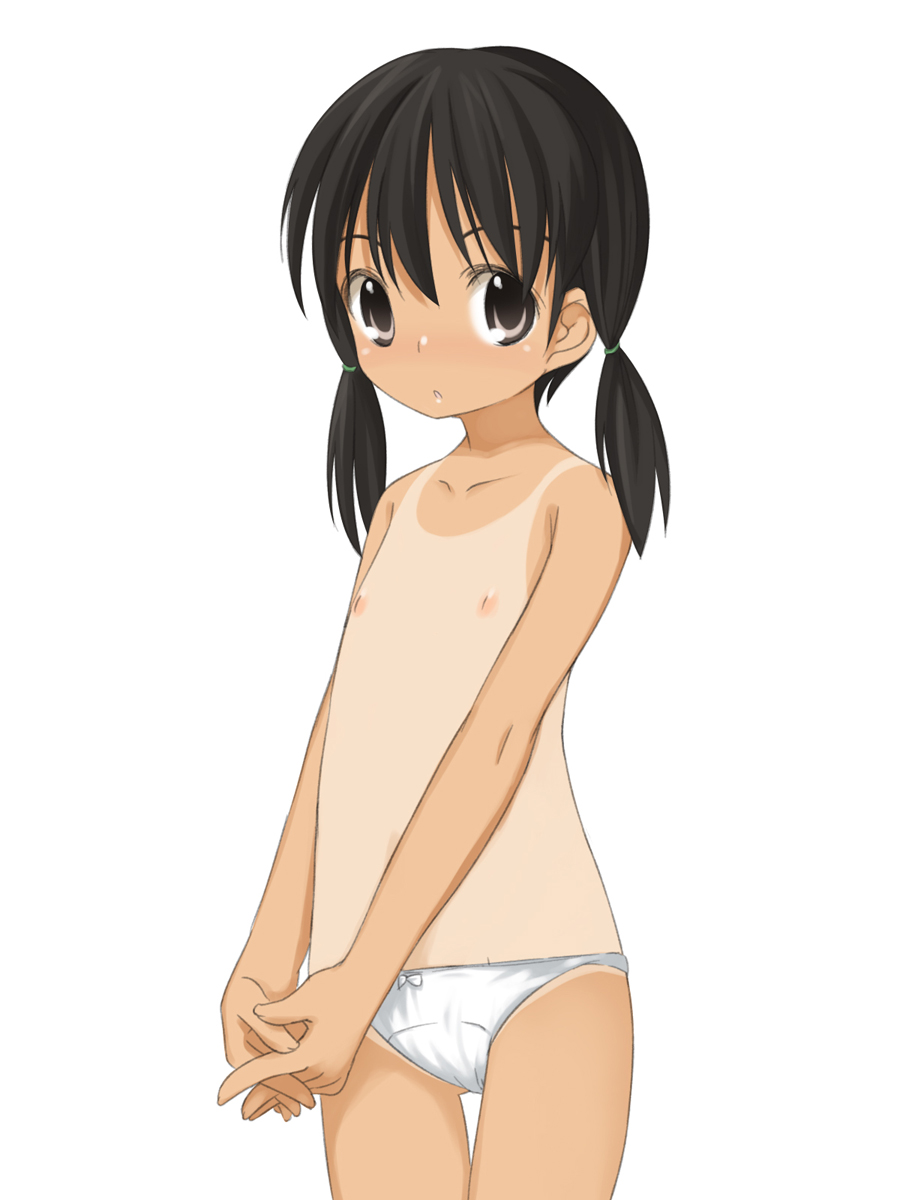 1girlblack hairfemale focusflat chestlolinipplesone-piece tanpantiesshort hairsolotantanlinetopless femaletwintailsunderwear