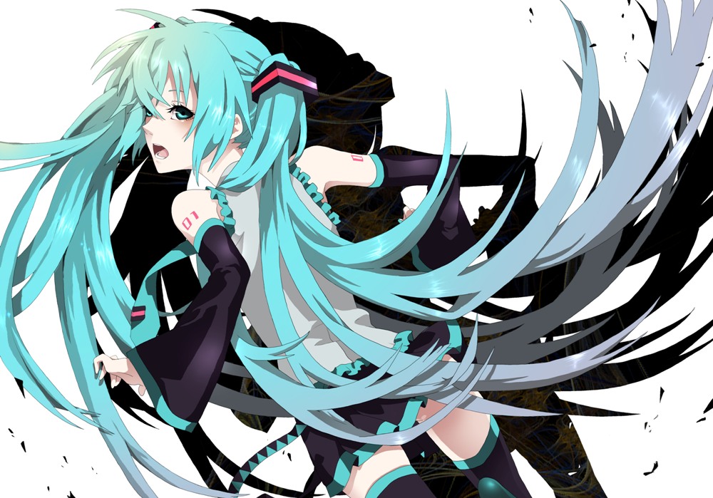 1girlaqua eyesaqua hairdetached sleevesfemale focuslong hairnecktieskirtsolothighhighstwintailsvery long hairwhite backgroundzettai ryouiki