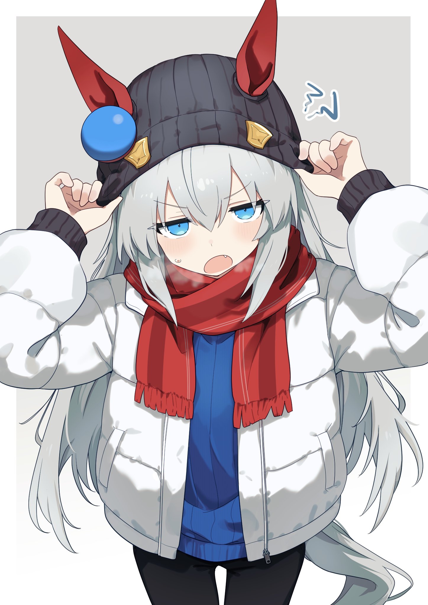 1girlalternate costumeanimal earsbeanieblack hatblack leggingsblue eyesblue sweaterblushbreathcoatear coversear ornamentears through headweargrey hairgrey tailhair between eyeshathorse earshorse girlhorse tailleggingslong hairlong sleeveslooking at vieweropen clothesopen coatopen mouthred scarfscarfsolosweatdropsweatertailvery long hairwhite coatwinter clotheswinter coat