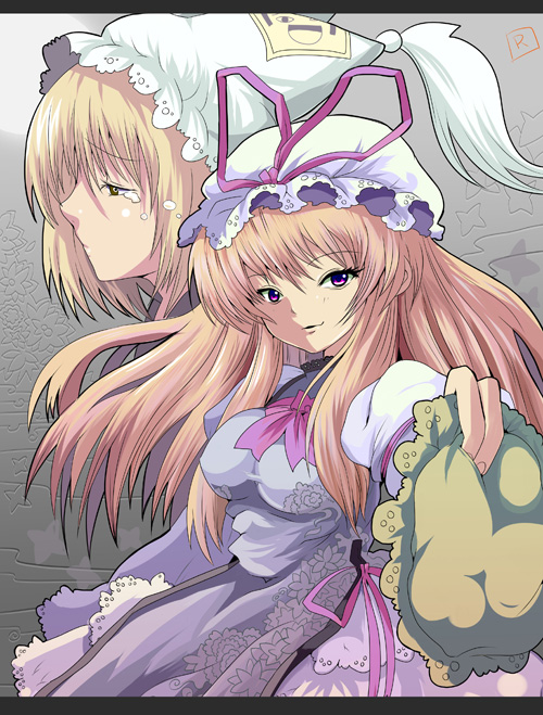2girlsblonde hairbreastsdressfemale focusgradient backgroundhatlong hairmultiple girlspurple eyesshort hairtearsyellow eyes