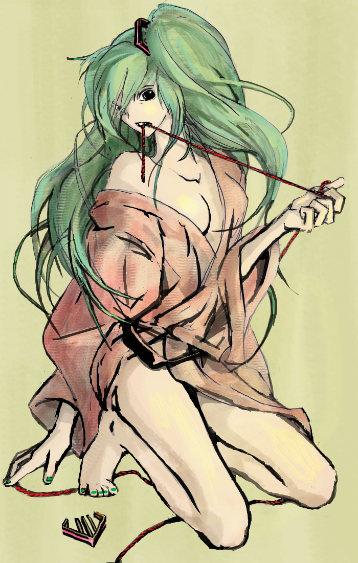 1girlbarefootblack eyesbreastscleavagecovered erect nipplesfemale focusgreen hairgreen nailsjapanese clotheskimonokneelinglong hairmouth holdnail polishsolostringtwintails