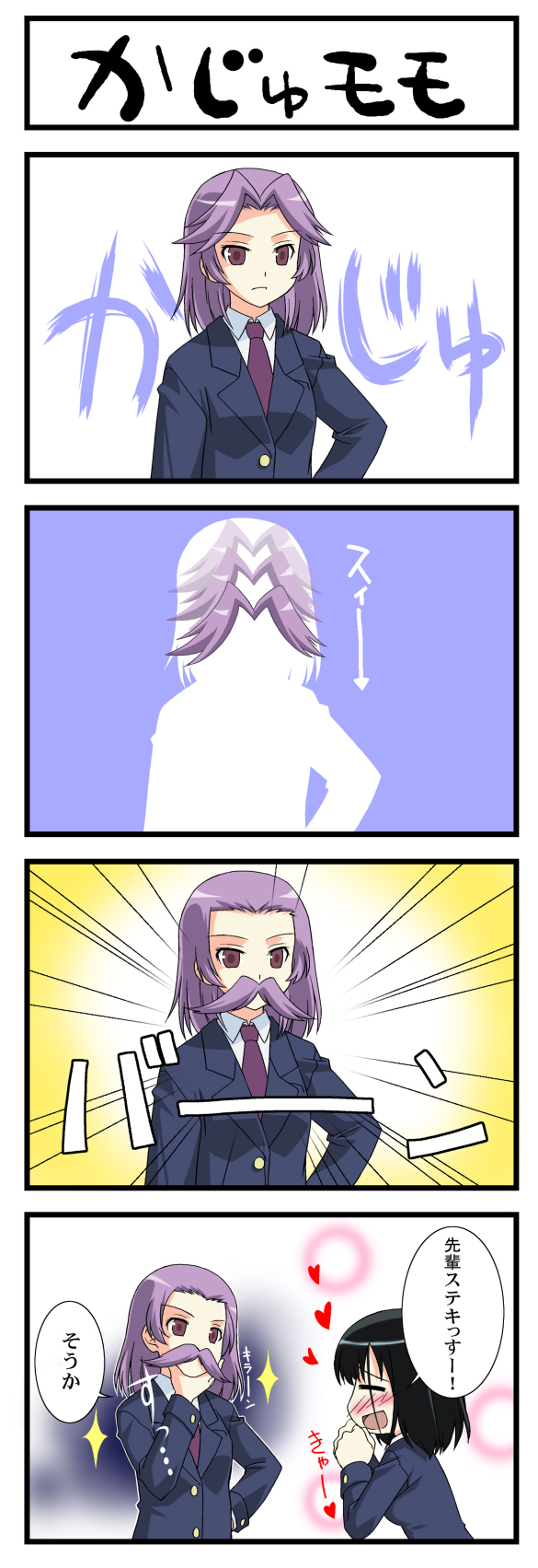 00s2girls4komablack hairblazercomicfacial hairheartjacketmultiple girlsmustachenecktiepurple hairred eyesschool uniformshort hairsmile