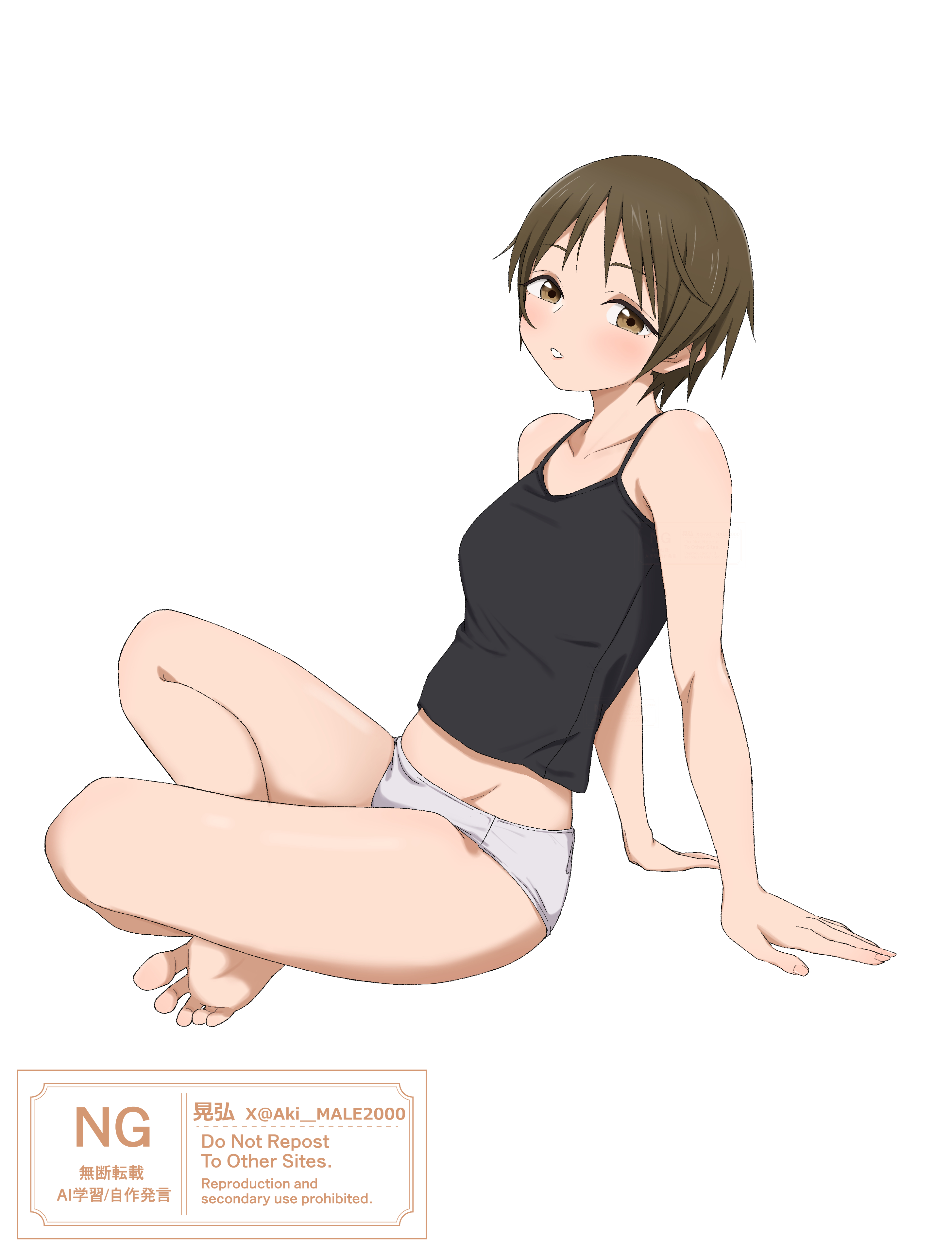1girlarm supportbarefootblack shirtbrown eyesbrown haircollarbonefeetfrom sidefull bodyindian stylelooking at viewermidriffpantiesparted lipsshirtshort hairsimple backgroundsittingsleevelesssleeveless shirtsolessolounderwearwhite backgroundwhite panties