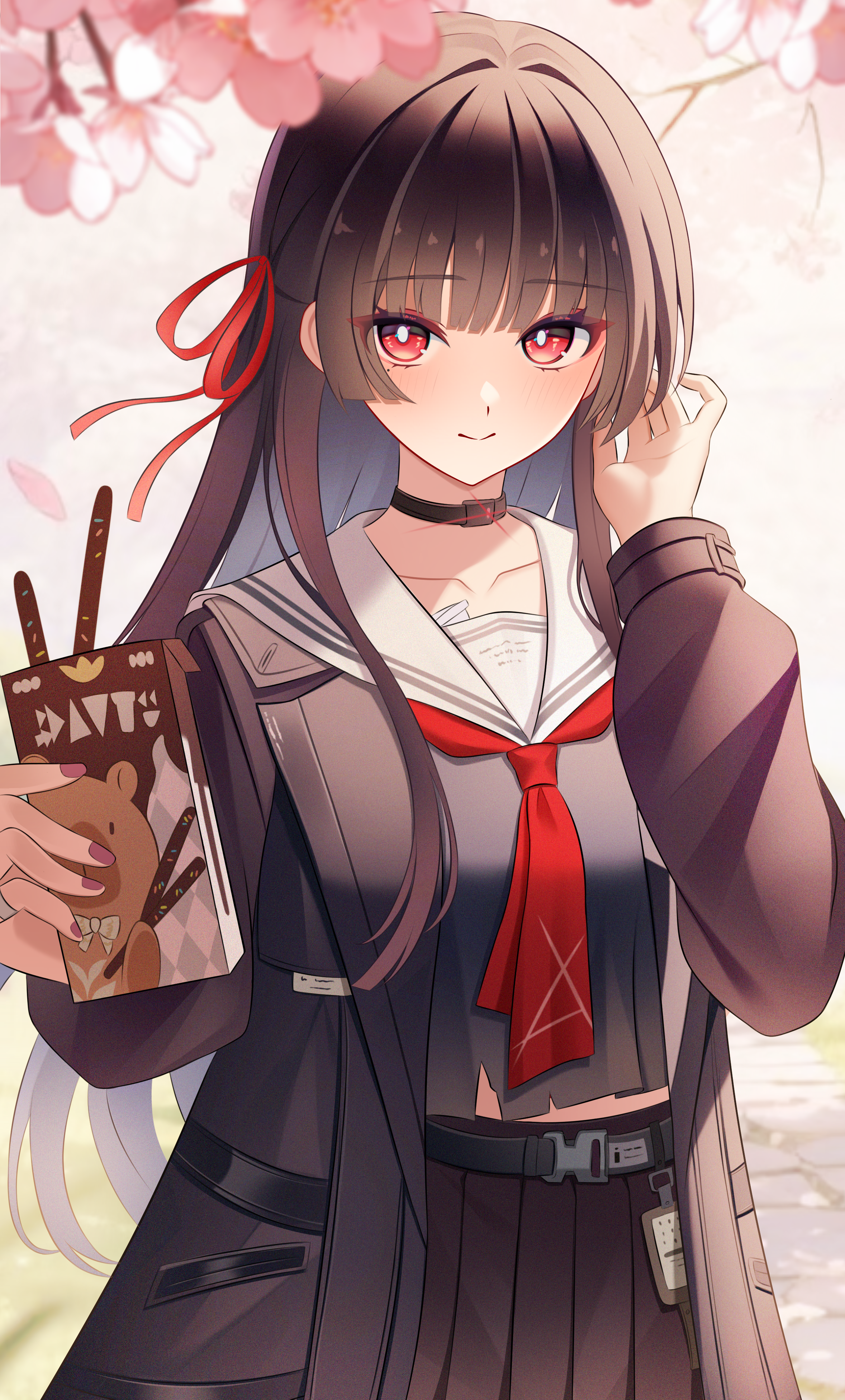 1girlblack chokerblack hairblack jacketblack serafukublack shirtblack skirtboxbreastschokerclosed mouthcollarbonecowboy shotfoodhair ribbonhand upholdingholding boxjacketlong hairlooking at viewermedium breastsmidriff peekmolemole under eyepockyred eyesred ribbonribbonsailor collarschool uniformserafukushirtskirtsmilesolowhite sailor collar