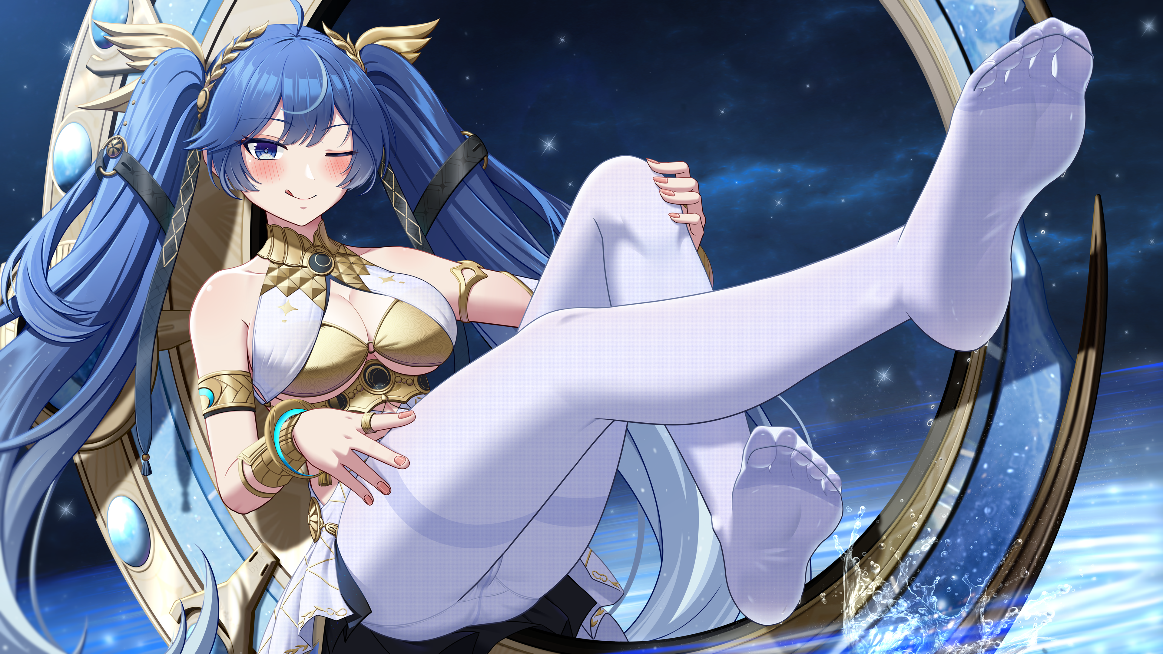 :q1girlahogeancient greek clothesarmletbare shouldersbarefootblue eyesblushbreastscleavageclosed mouthfeetfull bodygold bragradient hairgreco-roman clothesjewelrylarge breastslaurel crownlong hairlooking at viewermulticolored hairone eye closedoutstretched legpantyhosesmilesolessolothighband pantyhosethighstoestonguetongue outtwintailsvambracesvery long hairwhite pantyhose