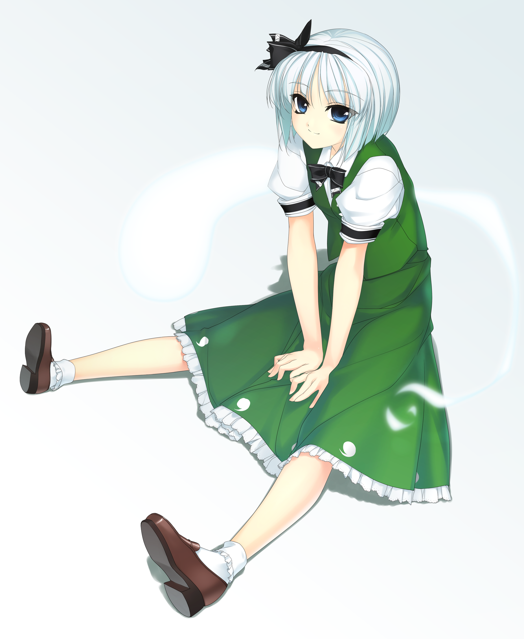 1girlblue eyesbobby socksdressfemale focusfull bodyghostgradient backgroundhairbandloafersshoe solesshoesshort hairsittingskirtsmilesockssolov armswhite background