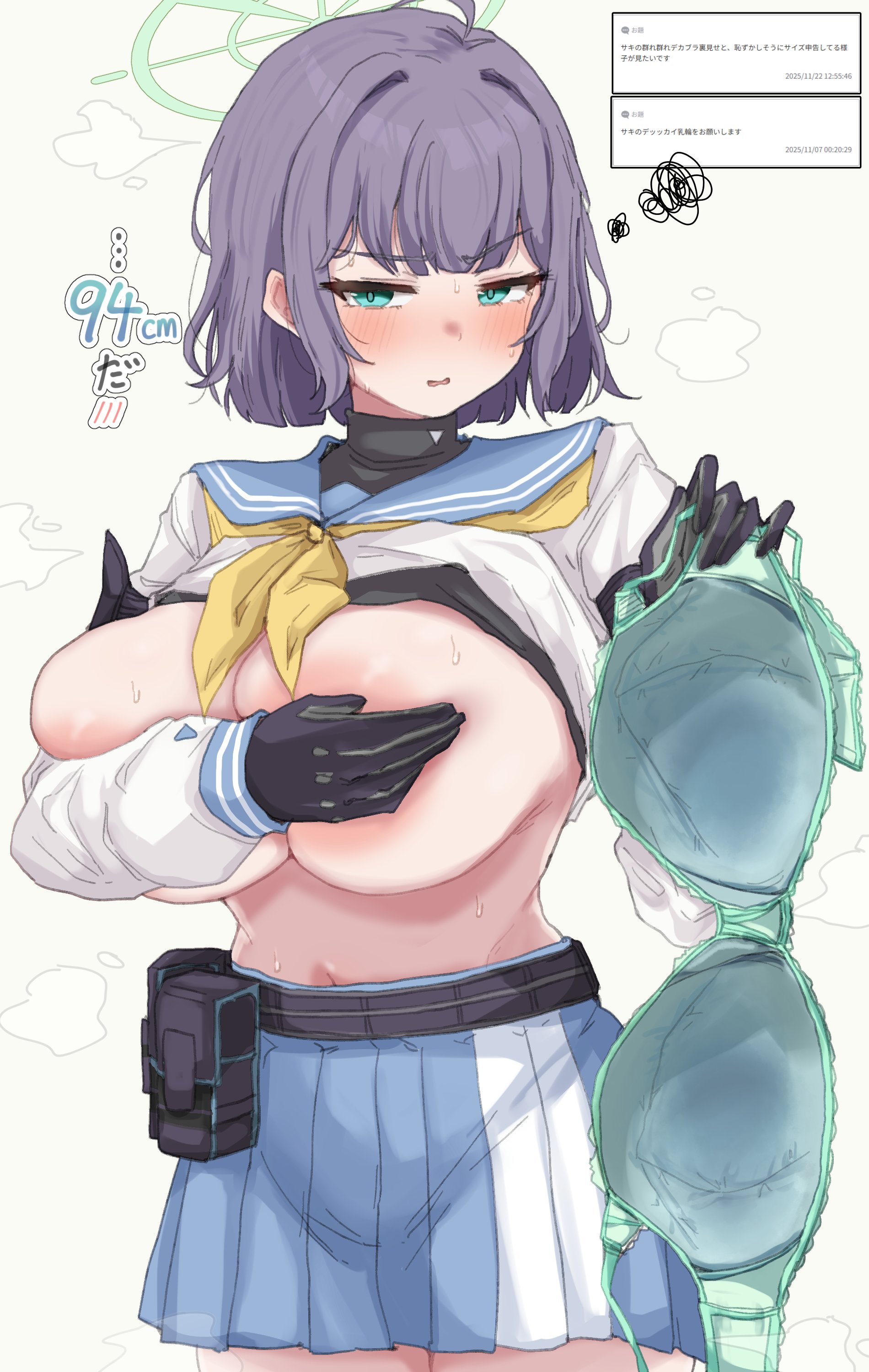 1girlbelt pouchblack glovesblack sweaterblue sailor collarblue skirtblushbrabreastscovering breastscovering privatescowboy shotglovesgreen bragreen eyesgreen halohaloholdingholding braholding underwearholding unworn clotheshuge breastslong sleeveslooking at viewerminiskirtnavelneckerchiefopen mouthpouchpurple hairrequest insetsailor collarsailor shirtshirtshort hairskirtsolosweaterturtleneckturtleneck sweaterunderwearunworn brawhite shirtyellow neckerchief