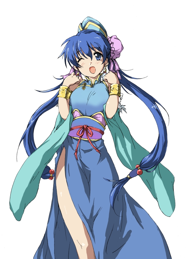 1girlblue eyesblue hairchina dresschinese clothesdouble bundresshair bunlong hairlow-tied long hairone eye closedsimple backgroundtwintailsvery long hairwink