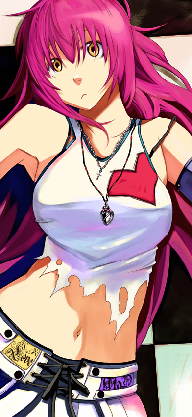 1girlcrossfemale focusheartjewelrylong hairmidriffnavelpendantpurple hairsolotank toptorn clothesvery long hairyellow eyes