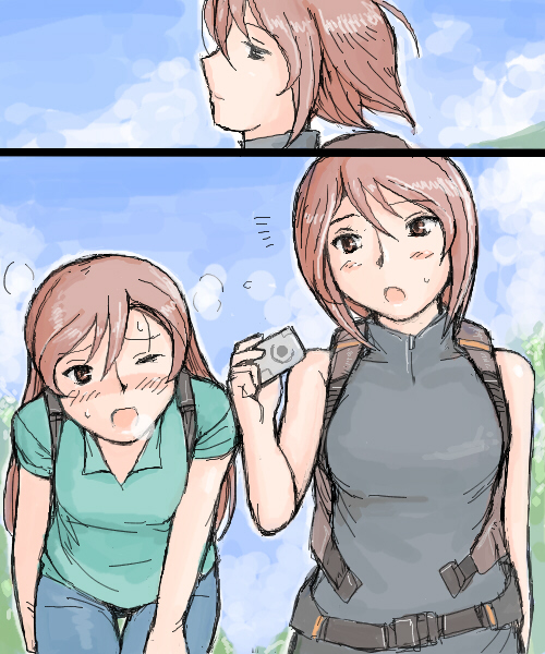 00s2girlsaged upblushbrown eyesbrown haircameracasualmultiple girlsone eye closedshort hairsiblingssisterstwinswink