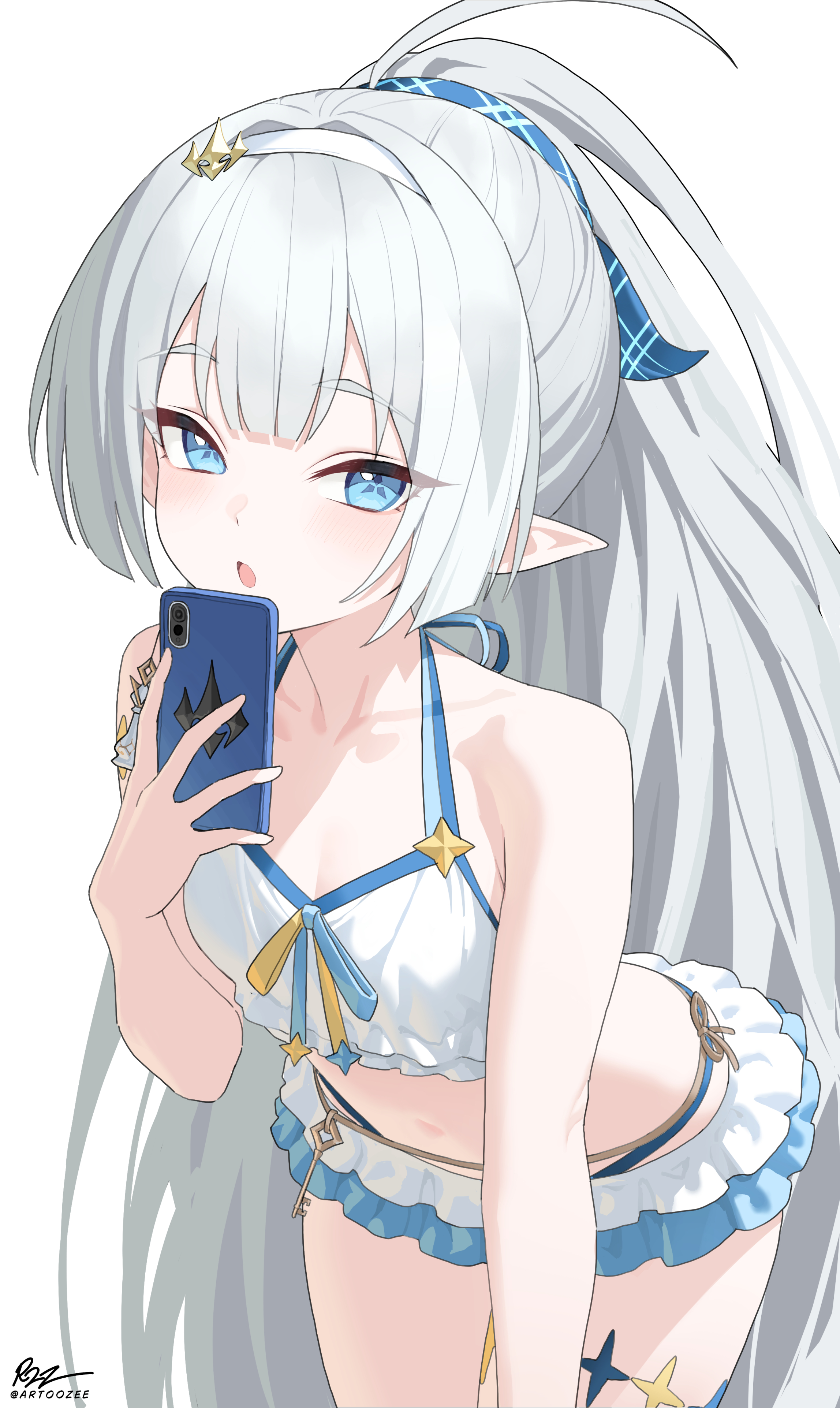 1girlbare armsbare shouldersbent overbikinibikini skirtblue eyesbreastscowboy shothairbandhalterneckholdingholding phonelong hairlooking at viewernavelopen mouthphonepointy earsponytailsimple backgroundsmall breastssolostomachswimsuitsymbol-shaped pupilsthighsvery long hairwhite backgroundwhite bikiniwhite hair