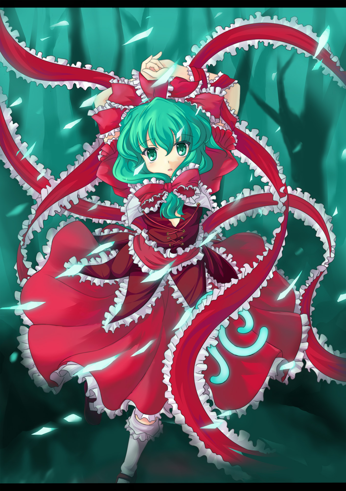 1girlarm ribbonarms upfemale focusfront ponytailgreen eyesgreen hairhair ribbonletterboxedmary janesmatching hair/eyespetalsribbonshoesshort hairsockssolo
