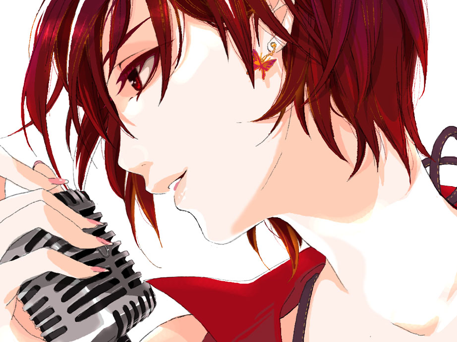 1girlearringsfemale focusjewelrymicrophonemicrophone standnail polishpink nailsprofilered eyesred hairred themeshort hairsolo