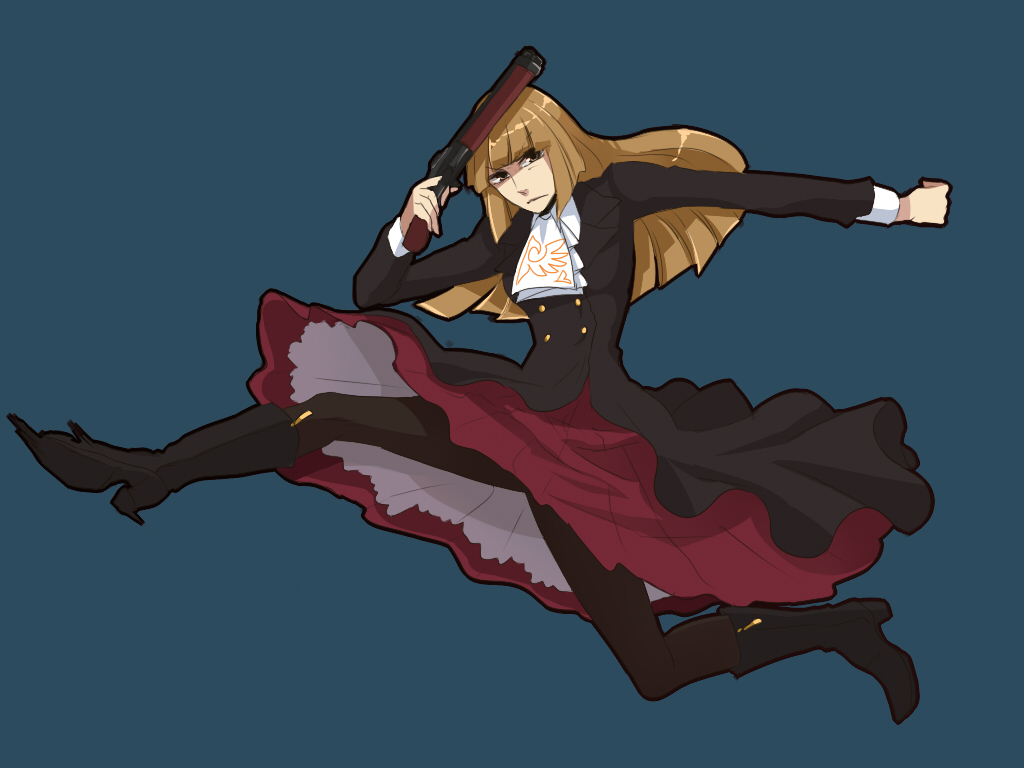 1girlblonde hairbootsdressfemale focusflying kickformal clothesfull bodygunhime cutkickinglong hairpantyhoseparodyserioussimple backgroundsolospinningspinzakuweapon