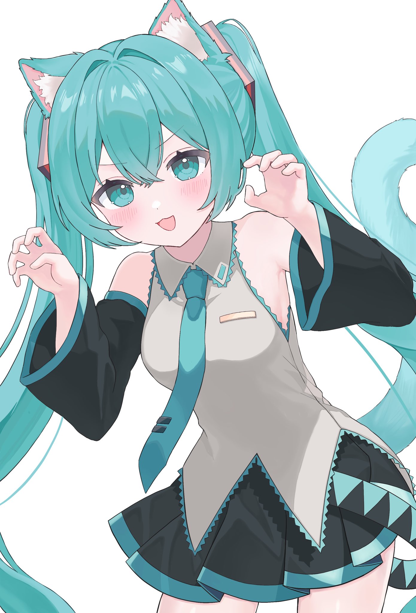 :3:d1girlanimal ear fluffanimal earsaqua eyesaqua hairaqua necktieaqua trimbare shouldersblack skirtblack sleevesblushbreastscat earscat girlcat tailcollared shirtcowboy shotcrossed bangsdetached sleevesfrilled shirtfrillsgrey shirthair between eyeshair intakeshair ornamenthands upkemonomimi modelong hairlong sleeveslooking at viewermedium breastsminiskirtnecktieomame 3deopen mouthpaw posepleated skirtshirtsidelockssimple backgroundskirtsleevelesssleeveless shirtsmilesolostandingtailtie cliptwintailsuntucked shirtvery long hairwhite backgroundwide sleeves