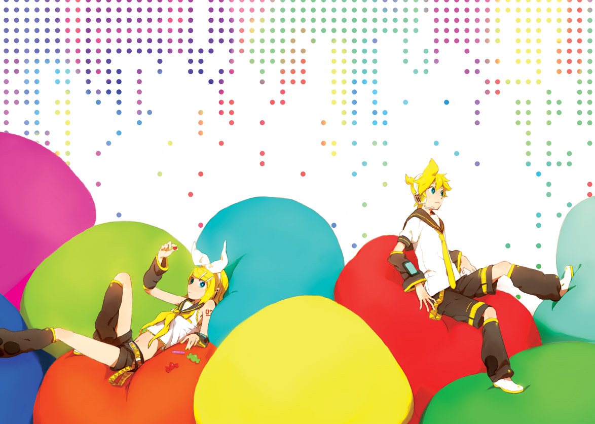 1boy1girlblonde hairblue eyesbrother and sistercandyhair ornamenthair ribbonhairclipheadphonesheadsetmidriffnecktiepillowribbonshort hairshortssiblingssittingtwins