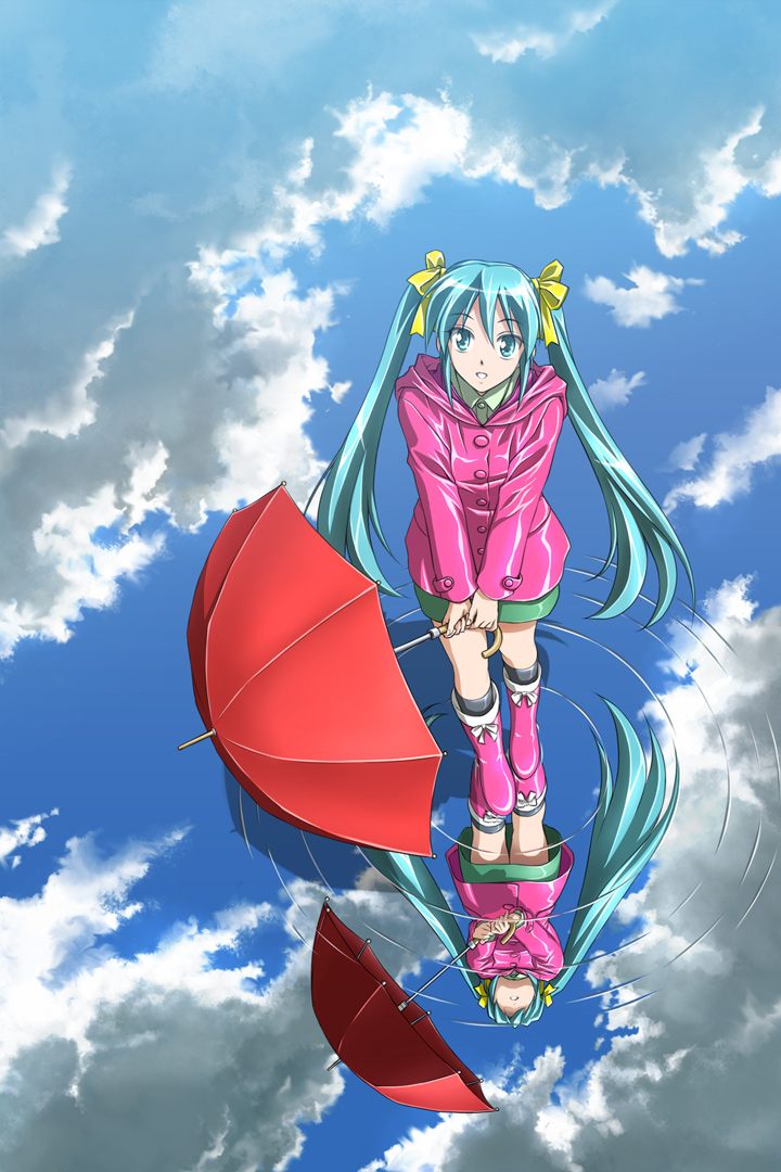 1girlaqua eyesaqua hairbootscloudcoatdayfemale focusfrom abovehair ribbonlong hairpink bootsreflectionreflective liquidribbonripplesrubber bootsskirtskysmilesolotwintailsumbrellawater