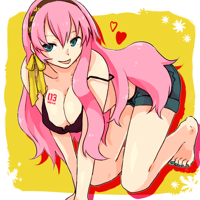 1girlall foursaqua eyesaqua nailsbarefootbreastscleavagefemale focushair ribbonhairbandheartlarge breastslong hairmidriffnail polishpink hairribbonsmilesolo