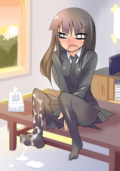 1girlblack haircumfeetfootjobformal clotheslong hairnecktiepantyhosepenissittingsolosuitwindowyellow eyes