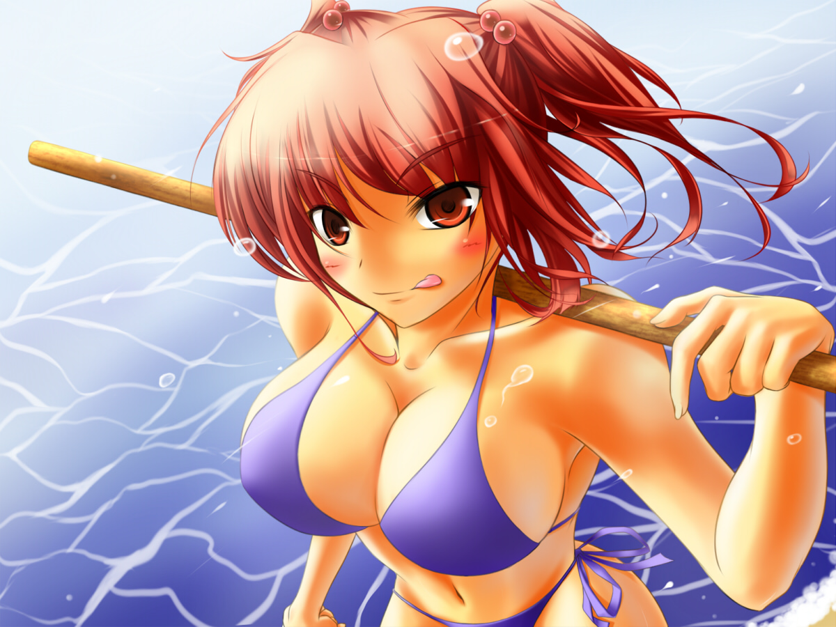 :q1girlbikiniblushbreastscleavagefemale focuslarge breastsnavelorange eyesperspectivepurple bikinired eyesred hairshort hairsolostickswimsuittonguetongue outtwintailstwo side up