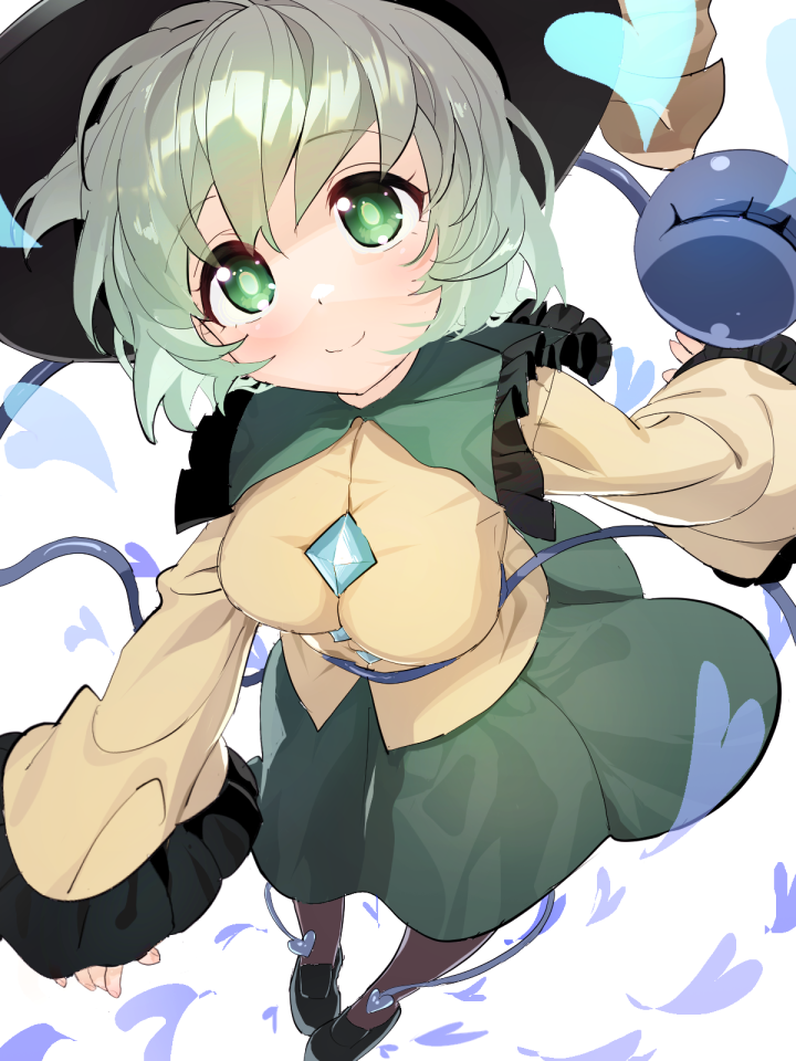 1girlblack hatblack shoesblushbreastsclosed mouthforeshorteningfull bodygreen eyesgreen hairgreen skirthatheartlong sleeveslooking at viewershirtshoesskirtsmilesolothird eyewhite backgroundyellow shirt