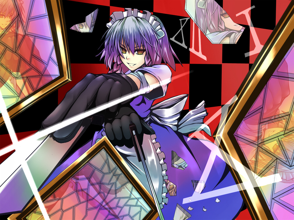 1girlblue dresscowboy shotdaggerdressfemale focusfrillsglintholdingholding weaponknifelooking at viewermaid headdresspuffy short sleevespuffy sleevesshort sleevessolostained glassstandingweaponyellow eyes