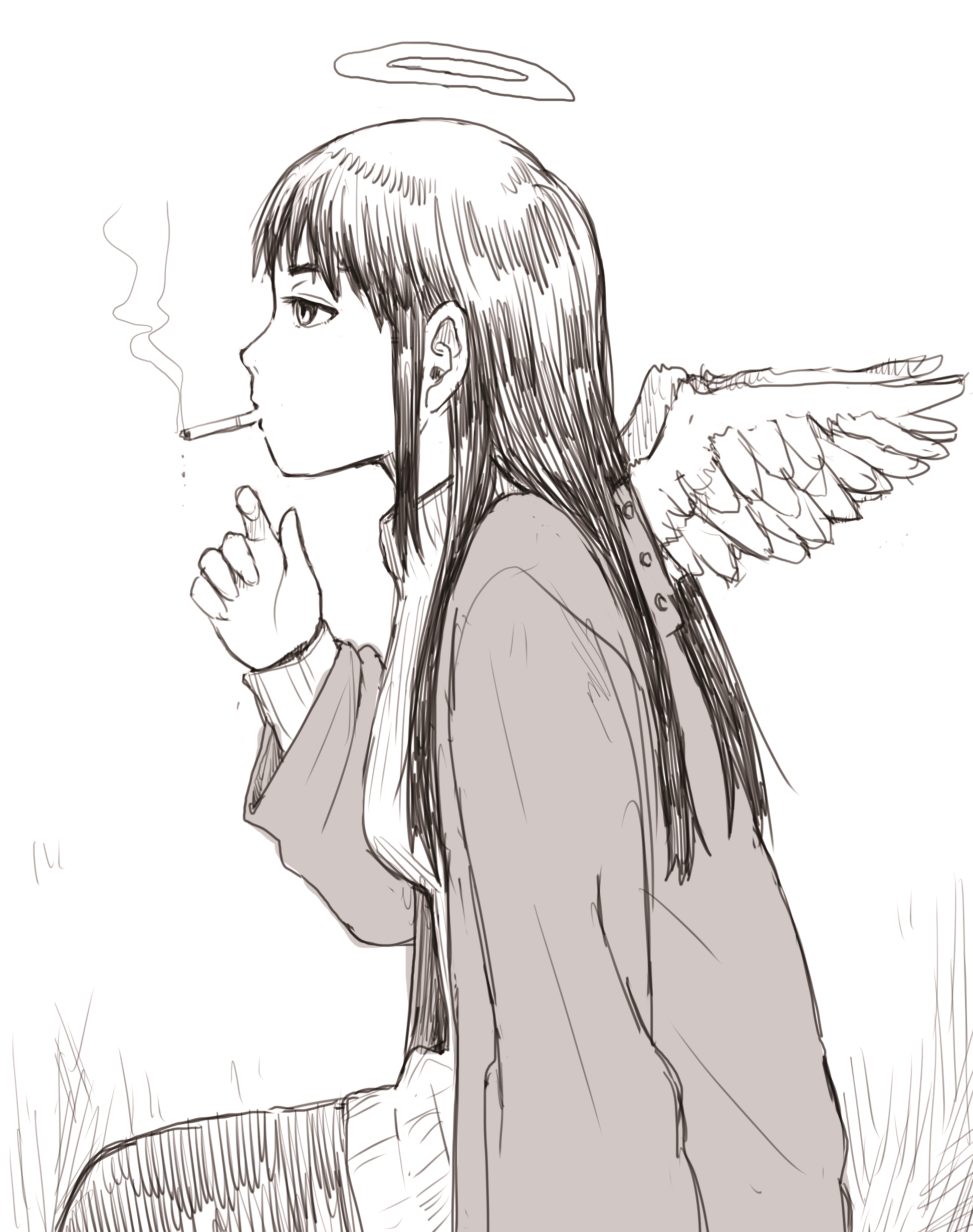 1girlcardigancigarettecoathalohand uplong hairmonochromemouth holdprofilesittingsmokingsolowhite backgroundwings