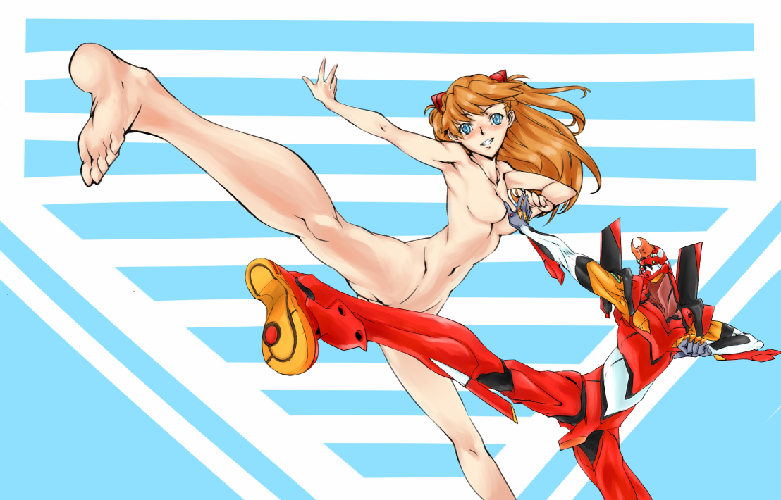 1girlarmpitsbarefootblue eyesblushbreastsbrown haircensoredcompletely nudeconvenient censoringfeetfemale focusflexiblehair ornamentkickinglong hairnudesimple backgroundsmilesolo