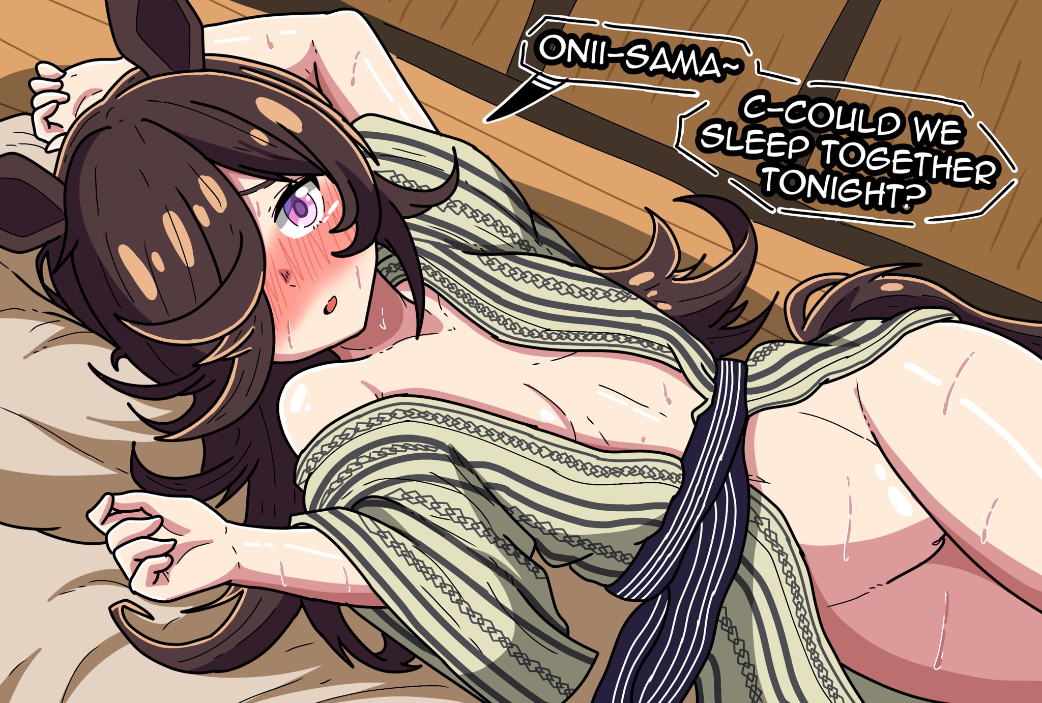 1girlanimal earsbath yukatabedblushbreastsbrown haircollarboneenglish texthair over one eyehorse earshorse girlhorse tailjapanese clotheskimonolong hairlooking at viewerlyingnaked kimonono brano pantiesobion bedopen clothesopen kimonoprint kimonopurple eyespussysashsmall breastssolotailyukata