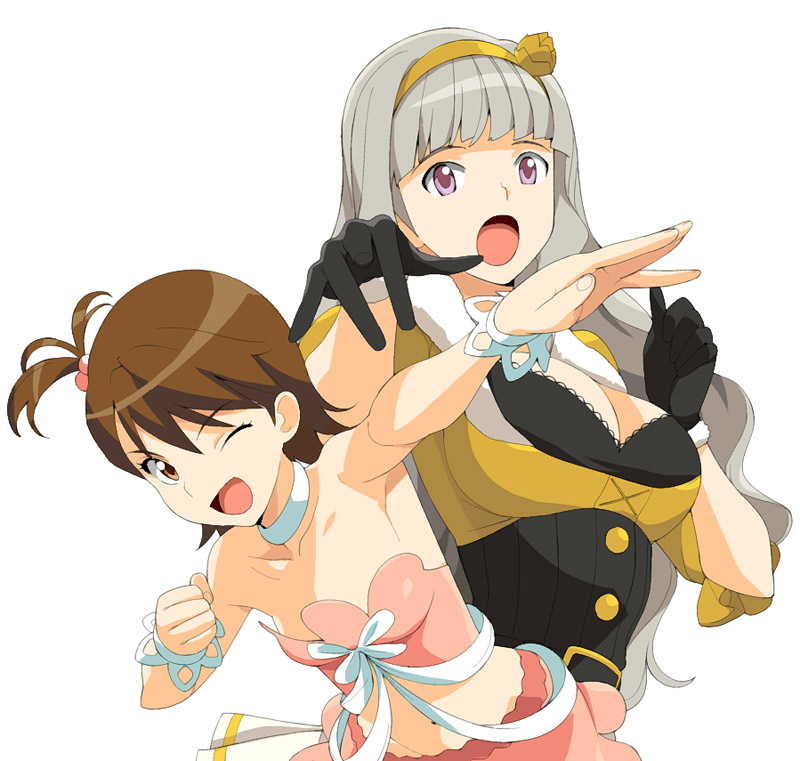 00s2girlsarmpitsbreastsbrown haircleavagecute & girly (idolmaster)grey hairlarge breastsmultiple girlsone eye closedwink