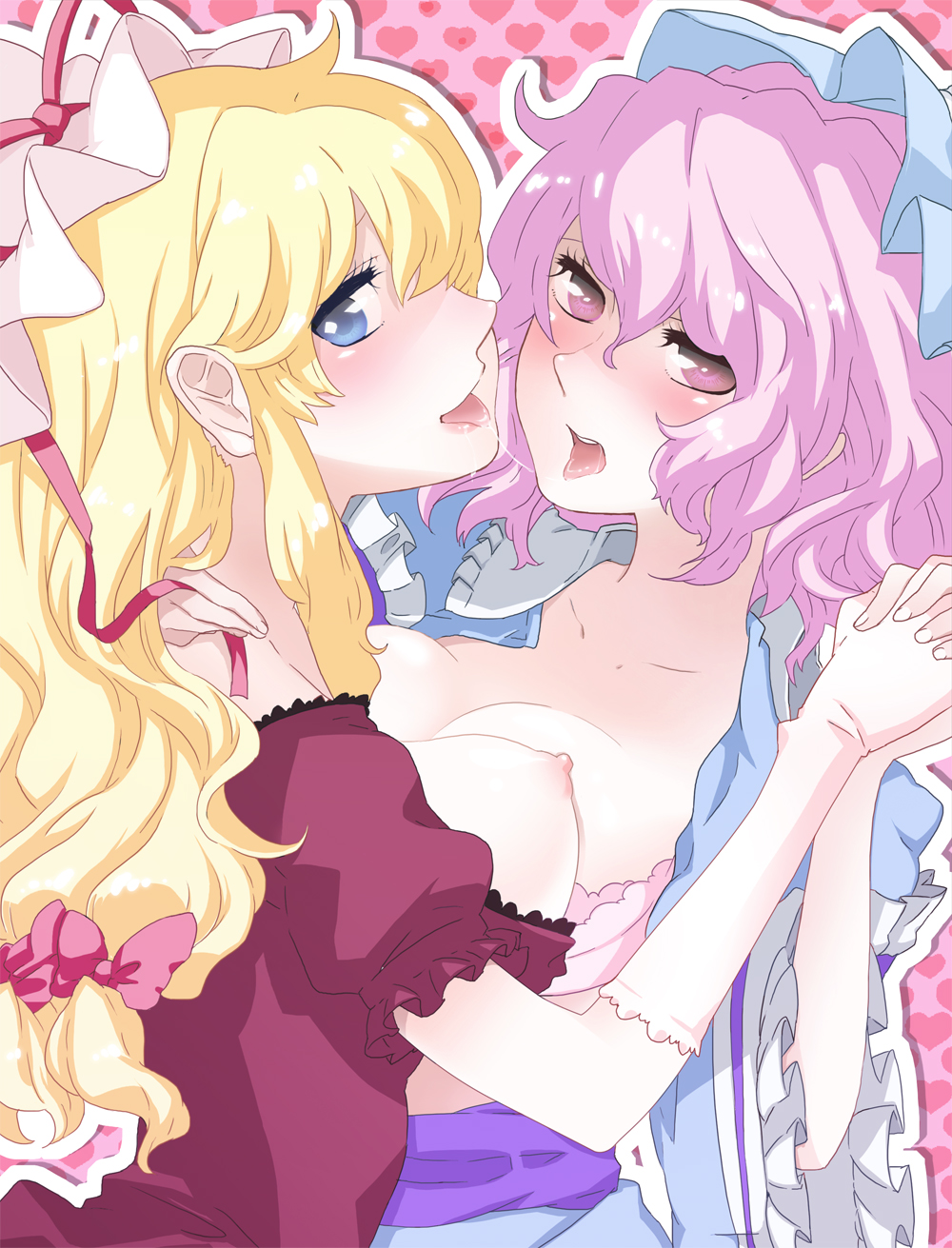 2girlsblonde hairblue eyesbrabreastscouplefemale focusgloveshatholding handsinterlocked fingerslingerielong hairmultiple girlsnipplesopen clothesopen shirtpink eyespink hairsalivasaliva trailshirtshort hairtongueunderwearyuri