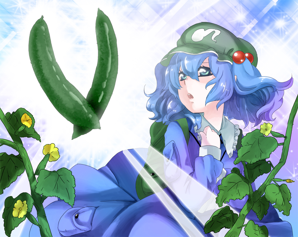 1girlbackpackbagblue eyesblue haircucumberfemale focusflowerhair bobbleshair ornamenthatmatching hair/eyesrandoserushort hairsolotwintailstwo side up