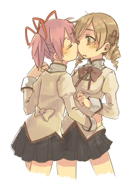 2girlsback bowblack skirtblonde hairbowbowtieclosed eyesdrill hairhand on another's waistkisslooking at anothermitakihara school uniformmultiple girlspink hairpuffy sleevesred bowred bowtieschool uniformshort twintailssimple backgroundskirttonguetongue outtwin drillstwintailswhite backgroundyuri