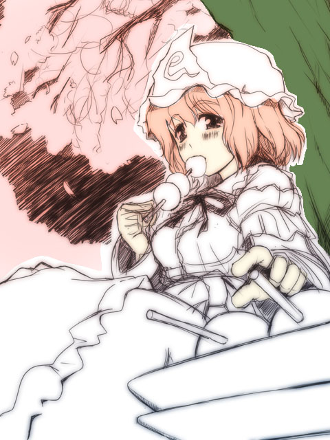 1girlcherry blossomsdangoeatingfemale focusfoodhanamihatpetalspink hairsakura watchingsketchsolotreewagashi