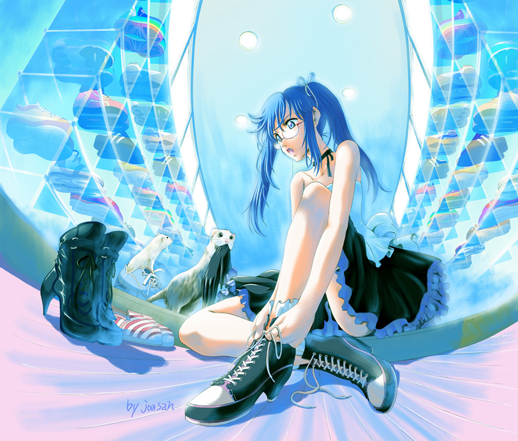 bare shouldersblue eyesblue hairbootschokerdressearringsferretfrillsglasseshigh heelsjewelrylace-up bootslaceslong hairopen mouthshoe tyingshoessneakerssolotwintails