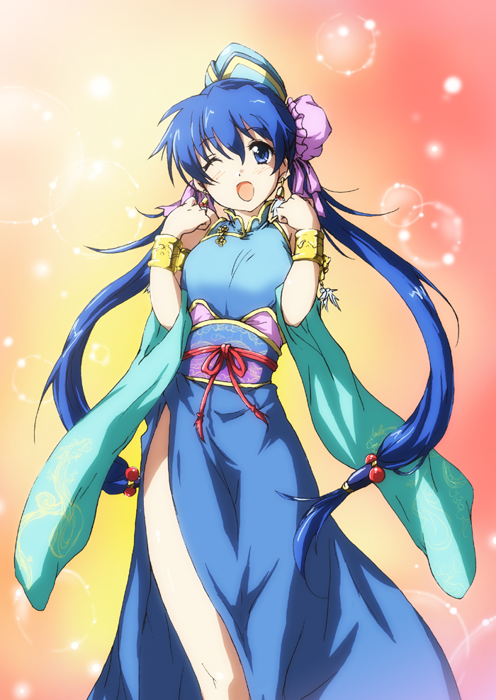 1girlarmletblue eyesblue hairbracerchina dresschinese clothesdressjewelrylong hairlots of jewelrylow-tied long hairone eye closedtwintailswink