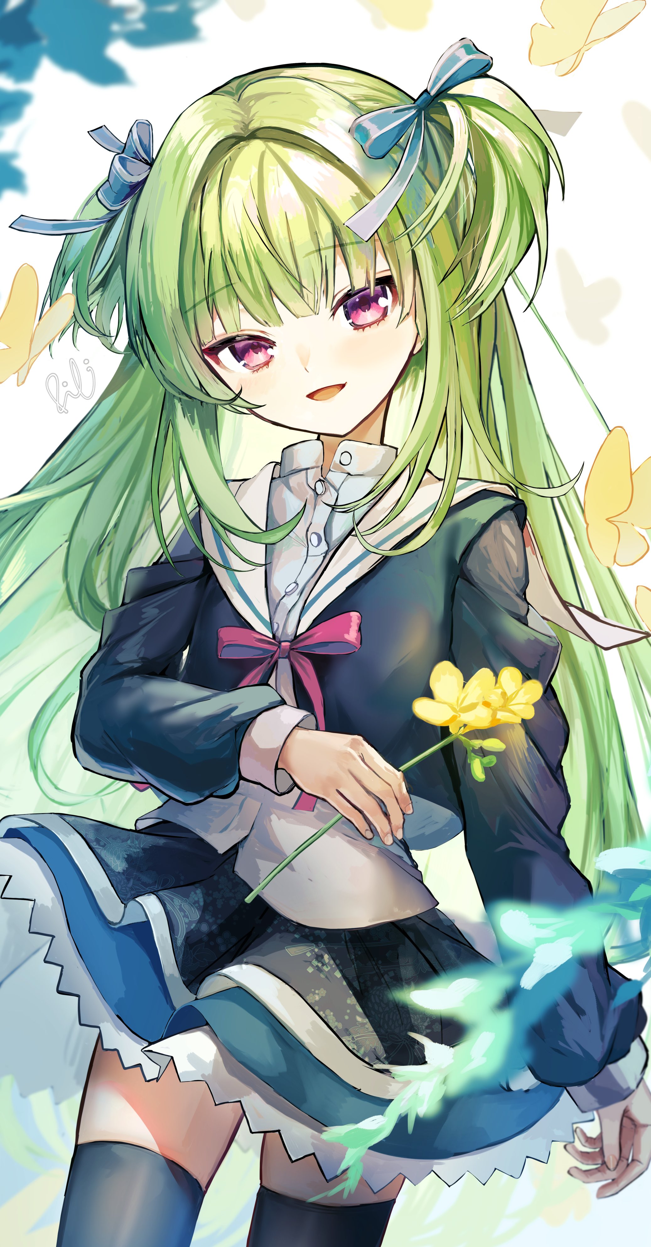 black thighhighsblunt bangsbowcollared shirtcrop topflowerfrilled skirtfrillsgreen hairhair intakesholdingholding flowerlong hairlong sleeveslooking at viewerpink eyesred bowshirtskirtsmilestraight hairthighhighstwo side upwhite shirtyellow flowerzettai ryouiki