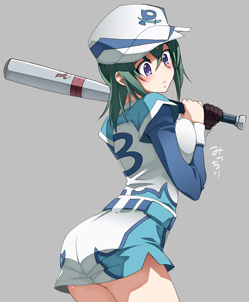 00s1girlassbaseball batbaseball capbaseball uniformblue eyesblushbreast pressbreastsfemale focusglovesgreen hairhatshortssimple backgroundsolosportswear