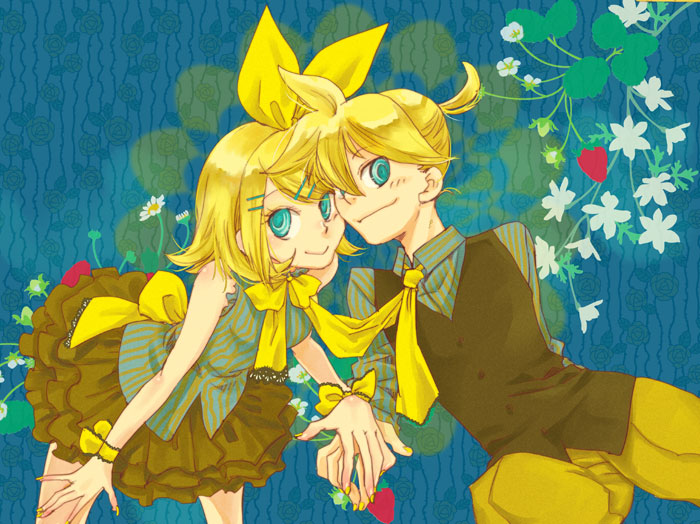 1boy1girlblonde hairblue eyesbrother and sisterflowerfoodfruithair ornamenthair ribbonhairclipheteroholding handsnail polishnecktieribbonshort hairsiblingsskirtsmilestrawberrytwinsyellow nailsyellow necktie