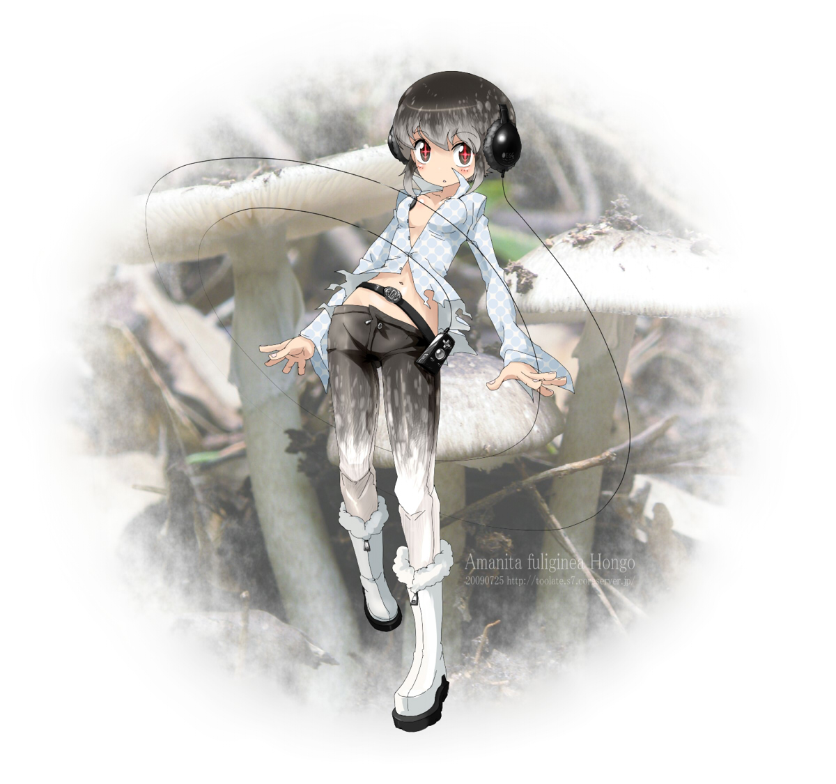 1girlbeltbootsfemale focusgrey hairheadphonesmidriffmushroomopen clothesopen shirtpantspersonificationshirtsolo