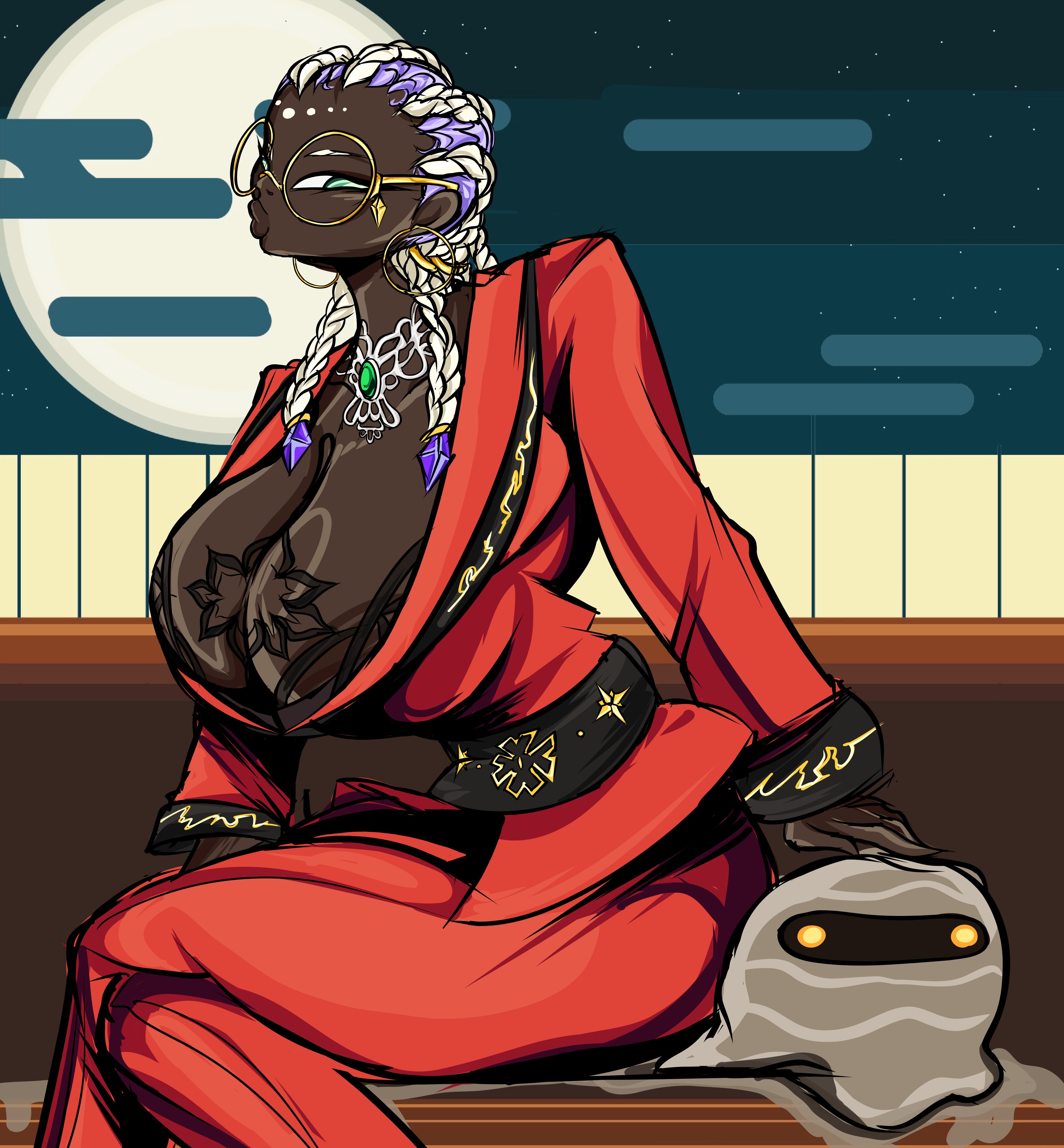 1girlbodypaintbrabreastscleavagecurvydark skindark-skinned femaledressfemale focusformal clothesglassesgoldgreen eyeshuge breastsjewelrylarge breastslingerielong hairmulticolored hairoutdoorspurple hairround eyewearsuitthedrown1thick thighsthighstwo-tone hairunderwearwhite hair