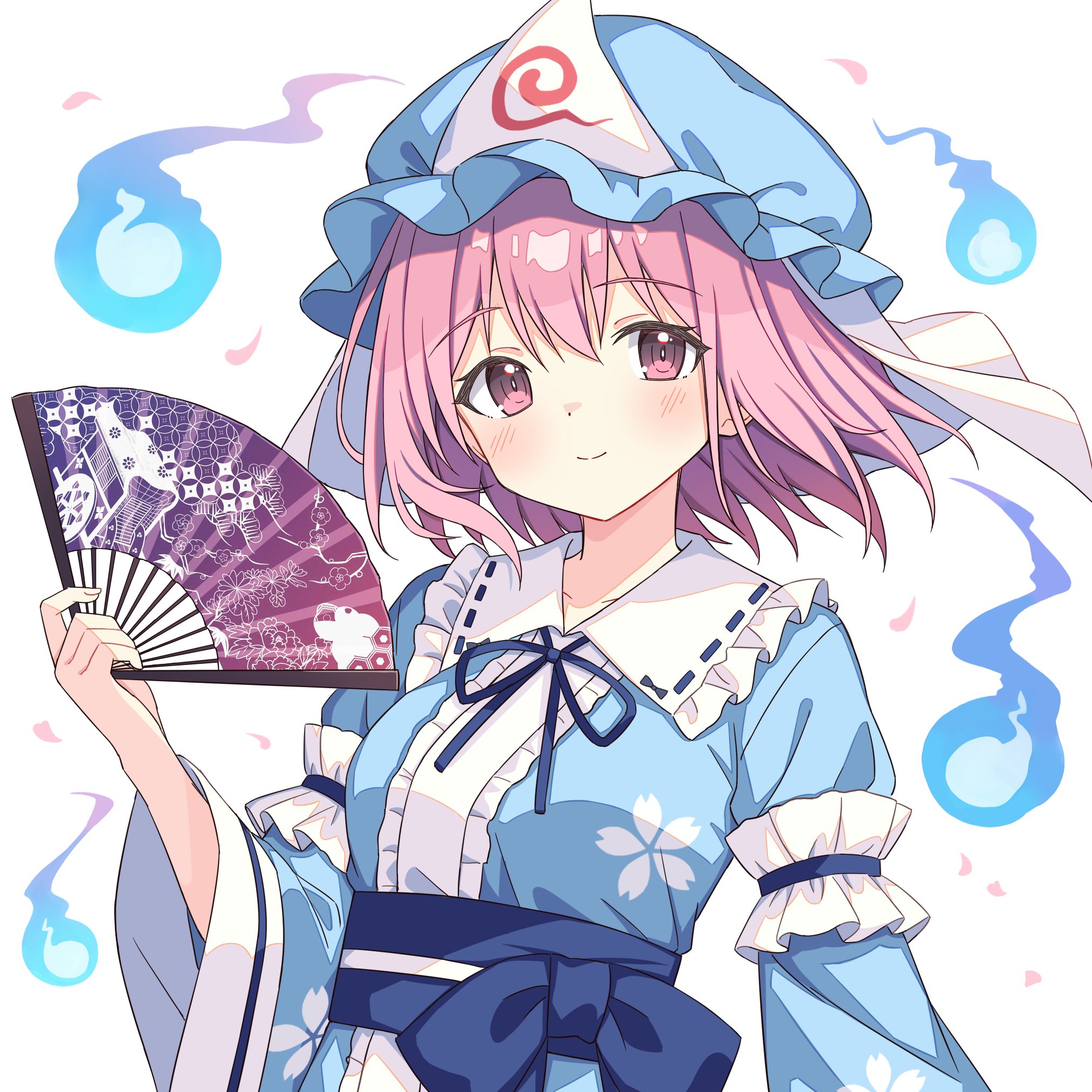 1girlblue kimonoblushfrillshand fanhathitodamaholdingholding fanjapanese clotheskimonolong sleeveslooking at viewermedium hairmob cappink eyespink hairsmilesolotriangular headpieceupper bodywhite background