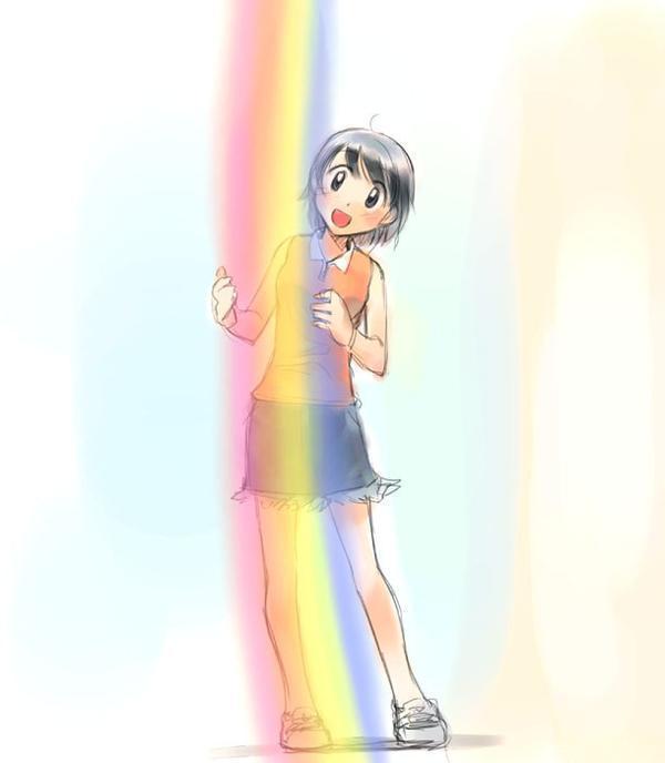 1girlblue eyesbreastsfemale focusfull bodyhead tiltlooking at vieweropen mouthorange shirtrainbowshirtshoesshort hairskirtsleevelesssleeveless shirtsmilesolostanding