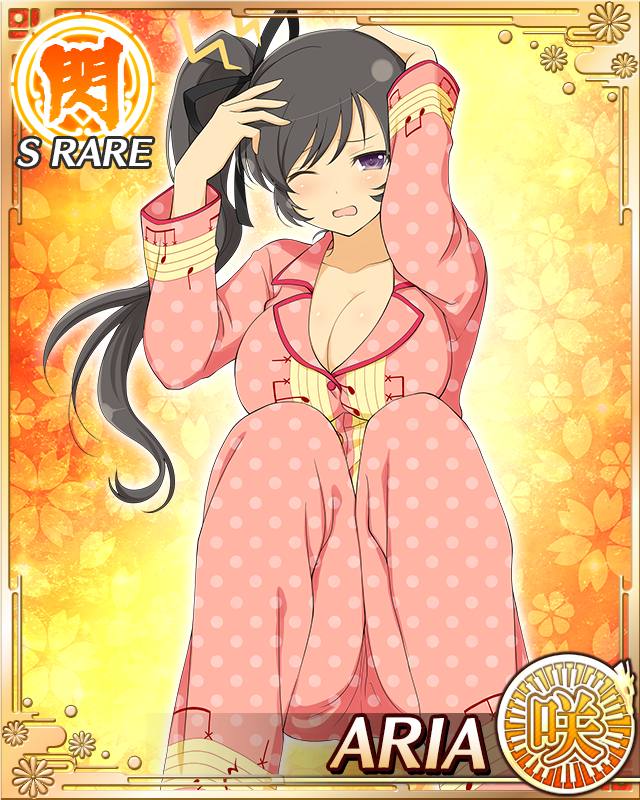 :o1girlblack hairblack ribbonborderbreastscard (medium)character nameenglish texthair ribbonheadachehigh side ponytaillarge breastslong hairlooking at viewerofficial alternate costumeone eye closedpajamaspink pajamaspolka dotpolka dot pajamaspurple eyesribbonsolosquatting
