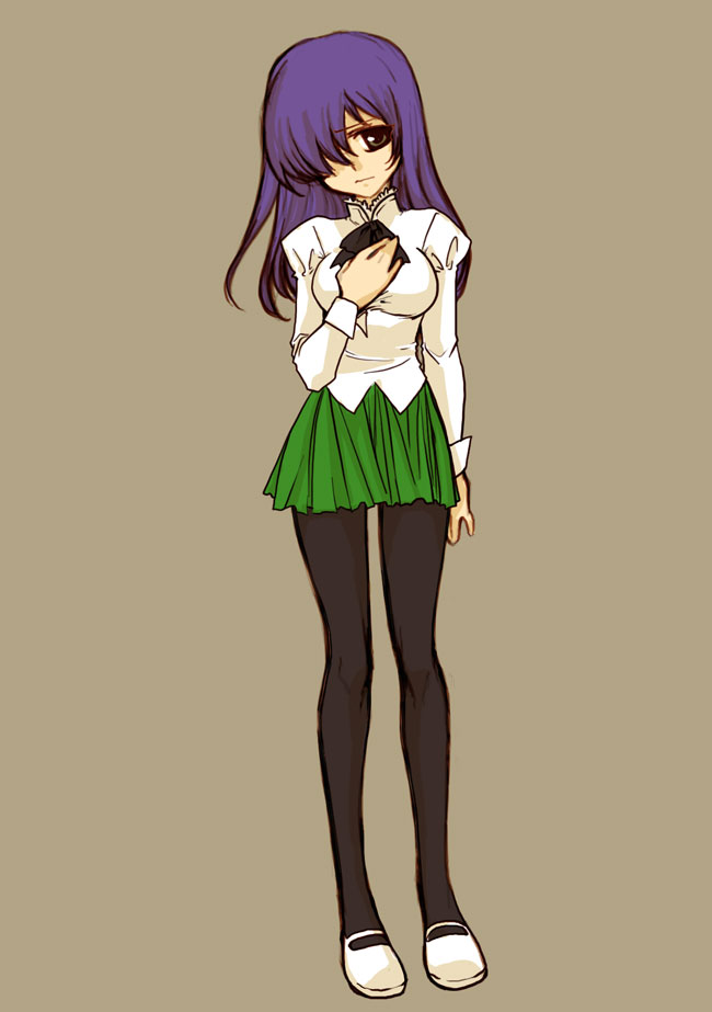 10s1girlbowbreastsbrown backgroundfull bodyhair over one eyehand on own chestlarge breastspantyhosepuffy sleevespurple hairschool uniformsimple backgroundskirt