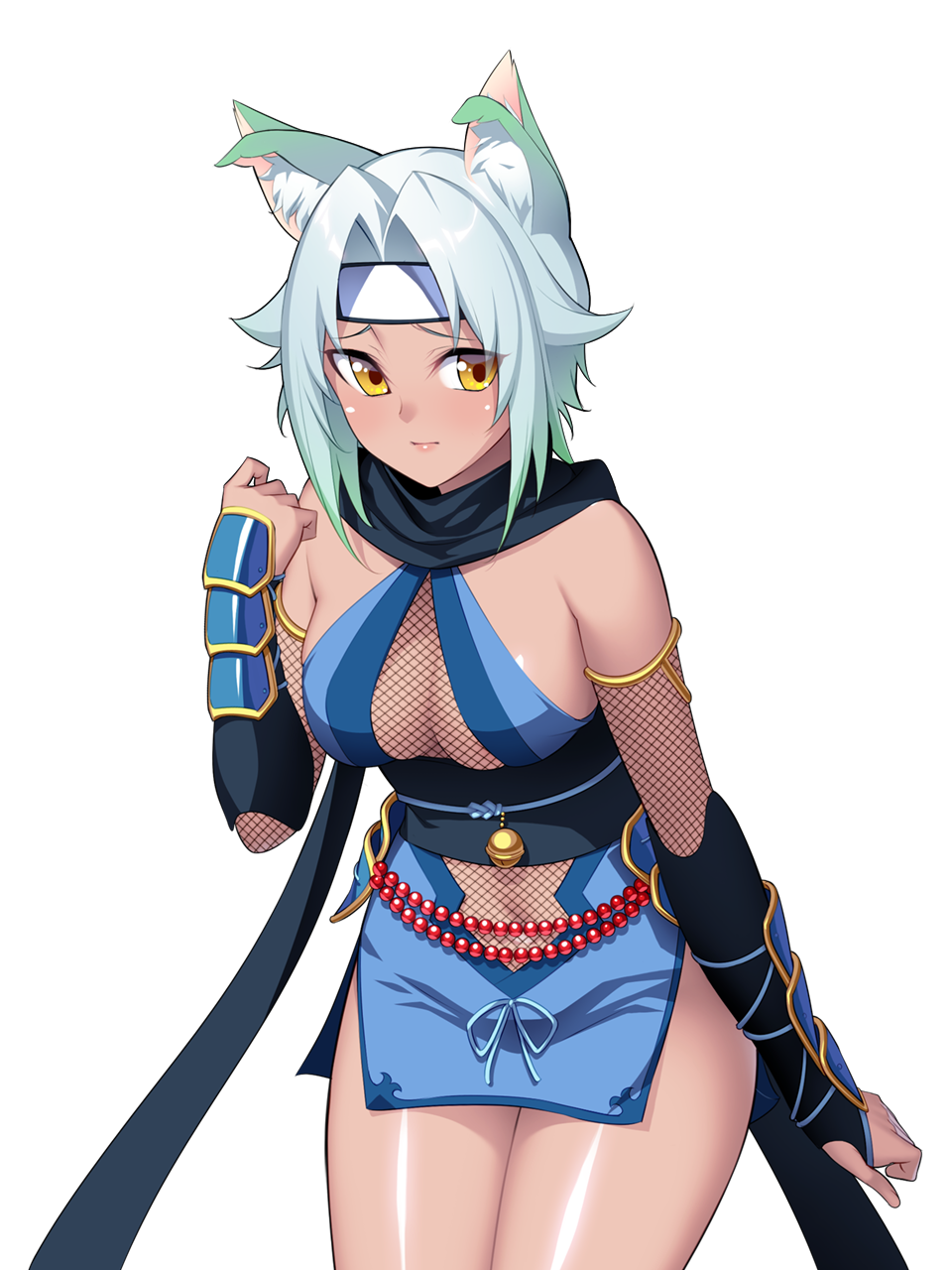 1girlanimal ear fluffanimal earsarm guardsbare shouldersblack scarfblue dressblue hairblushbreastscat earscleavageclosed mouthcowboy shotdark skindark-skinned femaledressfishnetsforehead protectorglovesgradient hairheadbandjapanese clotheslarge breastslooking at viewermagical girlmulticolored hairnavelninjasashscarfshindou yuki (lunatic angels)short hairsimple backgroundsolostandingthighstransparent backgroundwhite backgroundyellow eyes