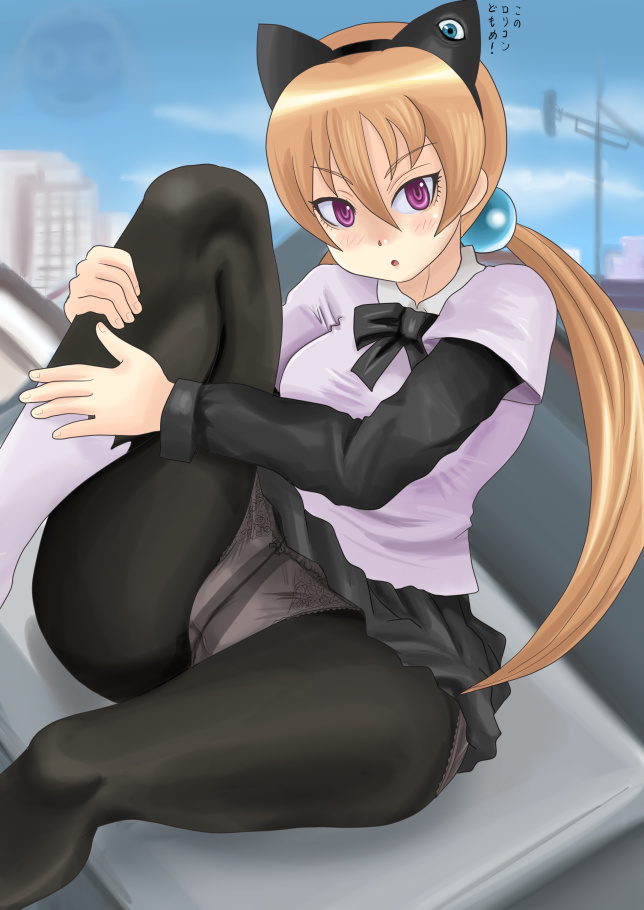 animal earsblonde hairbowcat earsheadbandpantiespantyhosepurple eyessittingskirttwintailsunderwear