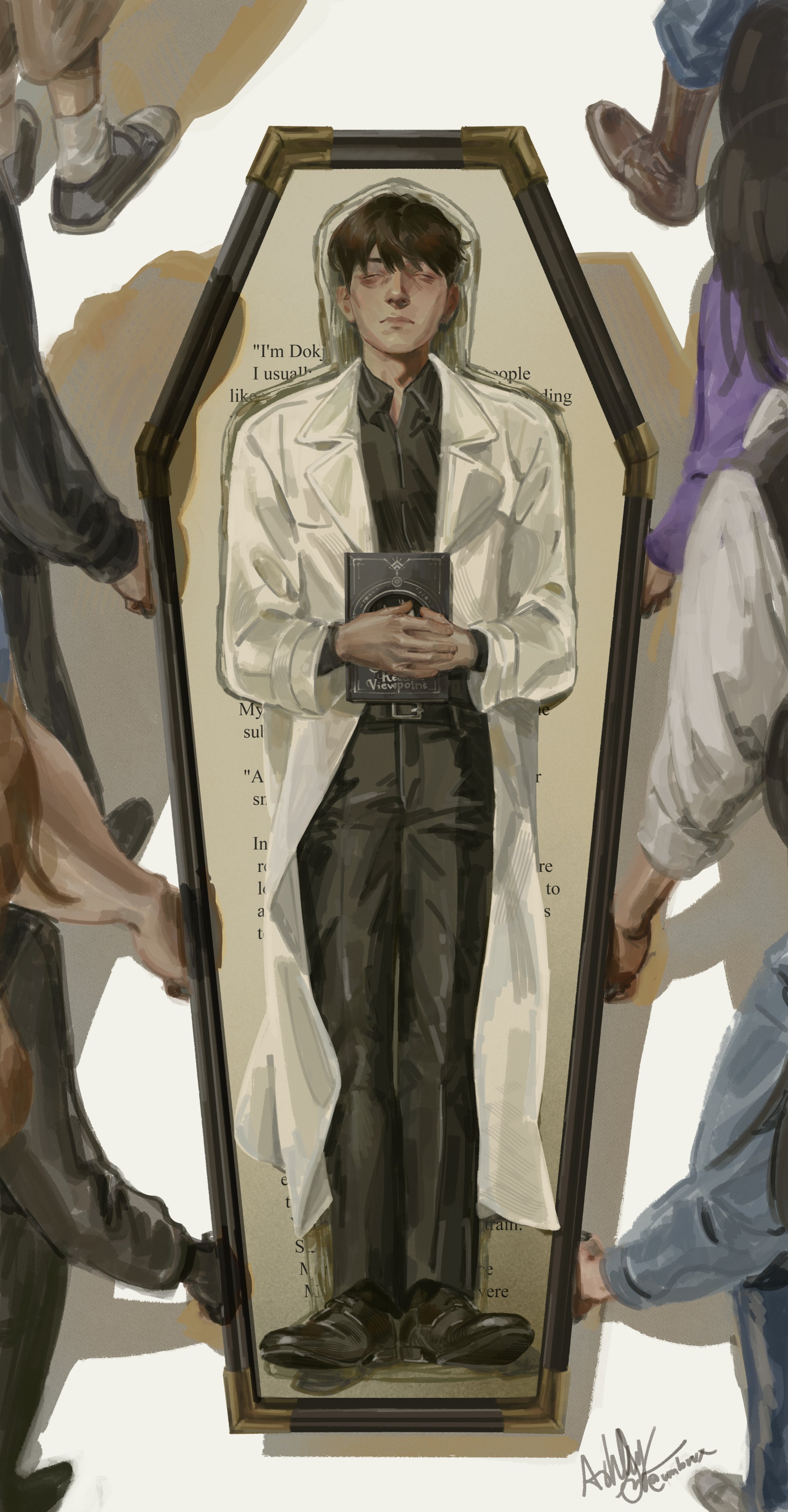 1boy6+othersblack hairblack shirtbookcarryingclosed eyescoatcoffincollared shirtcorpseenglish textfrom abovefull bodyhand on own stomachholdinglyingmultiple othersofficial art inseton backopen clothesopen coatout of frameshirtshort hairwhite coat