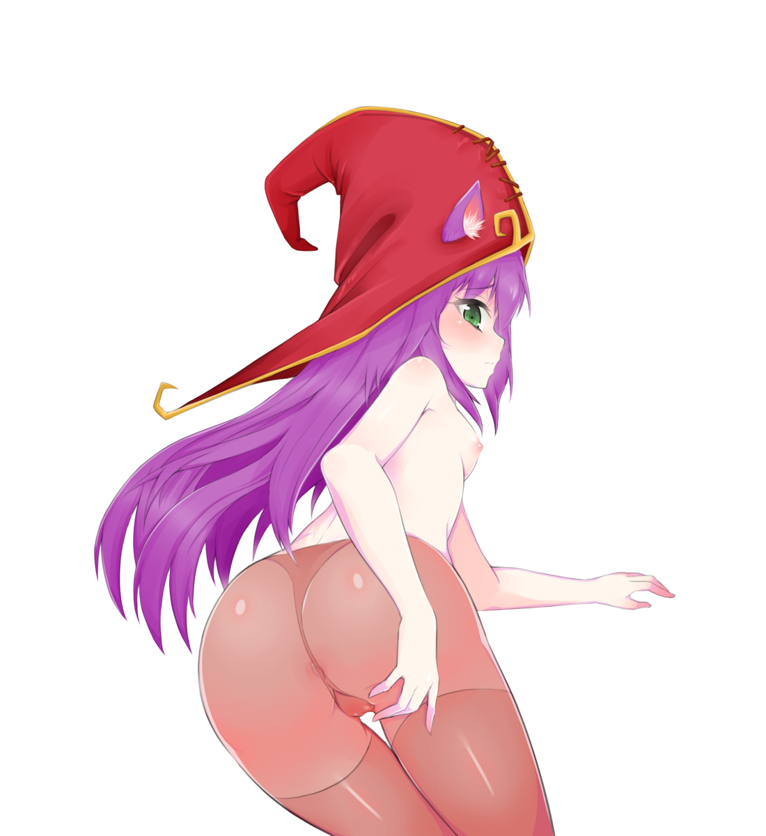 1girlsanimal earsassblushfemalefemale onlyFlag for Deletionfrom behindgreen eyeshatlooking at viewerpettankopurple hairsolothigh highsthighs
